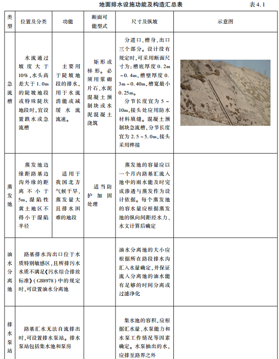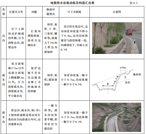 路基地表排水设施包括边沟、截水沟、排水沟、跌水与急流槽、蒸发池、油水分离池、排水 泵站等ꎬ 各地面排水构造物的构造要求如表 4. 1 所示ꎮ