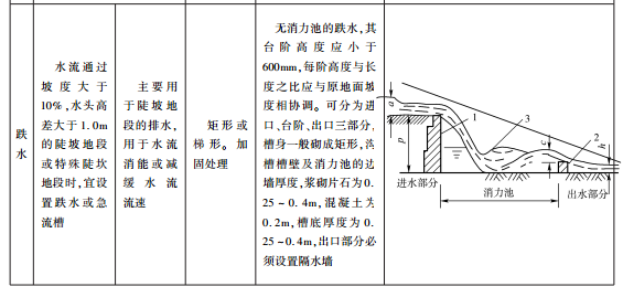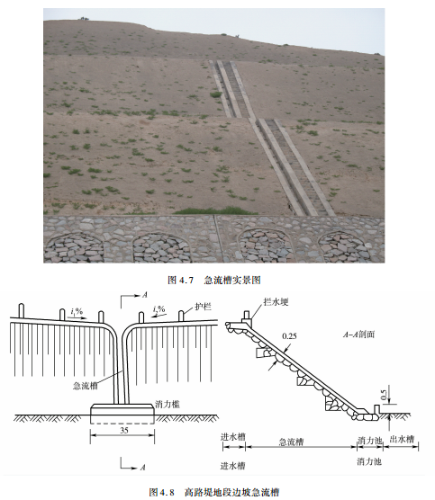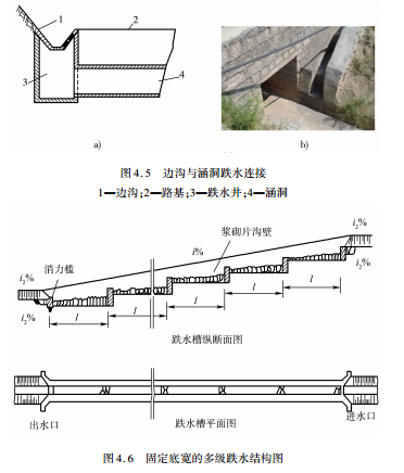 跌水与急流槽是路基地面排水沟渠的特殊形式ꎮ 水流通过坡度大于 10% ꎬ水头高差大 于 1. 0m 的陡坡地段或特殊陡坎地段时ꎬ需设置跌水或急流槽ꎮ 由于纵坡陡、水流速度快、冲 刷力大ꎬ要求跌水与急流槽的结构必须稳固耐久ꎬ通常应采用浆砌块石或水泥混凝土预制块 砌筑ꎬ并具有相应的防护加固措施ꎮ