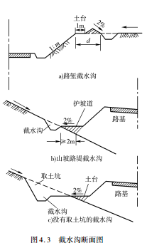 2. 截水沟 截水沟又称天沟ꎬ一般设置在挖方路基边坡坡顶以外ꎬ或山坡路堤上方的适当地点ꎬ用以拦截并排除路基上方流向路基的地面径流ꎬ减轻边沟的水流负担ꎬ保证挖方边坡和填方坡 脚不受流水冲刷ꎮ 降水量较少或坡面坚硬和边坡较低以致冲刷影响不大的路段ꎬ可以不设 截水沟ꎻ反之ꎬ如果降水量较多ꎬ且暴雨频率较高ꎬ山坡覆盖层比较松软ꎬ坡面较高ꎬ水土流失 比较严重的地段ꎬ必要时可设置两道或多道截水沟ꎮ