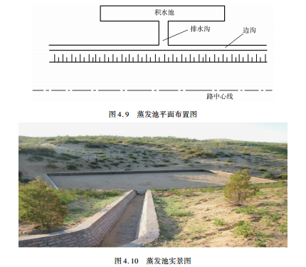 在气候干燥地区的排水困难地段ꎬ于公路两侧每隔一定距离ꎬ为汇集边沟流水任其蒸发 所设置的集水池为蒸发池ꎬ如图 4. 9、图 4. 10. 排水困难地段ꎬ以取土坑作为蒸发池ꎬ在雨水较少地区是一种较好的经济选择ꎮ 蒸发池与路基边沟(或排水沟)间应设排水沟连接ꎮ 蒸发 池边缘与路基边沟距离不应小于 5mꎬ池底宜设 0. 5% 的横坡ꎬ入口处与排水沟平顺连接ꎬ池 中水位低于排水沟的沟底ꎮ 蒸发池的容量应以一个月内路基汇流入池中的雨水能及时完成 渗透与蒸发作为设计依据ꎬ一般不超过 200 ~ 300m 3 ꎮ 蓄水深度不应大于 1. 5 ~ 2. 0mꎮ 蒸发 池四周应进行围护ꎬ防止行人落入池中ꎮ 也不得因设置蒸发池而使附近地基泥沼化或对周 围生态环境产生不利影响ꎮ