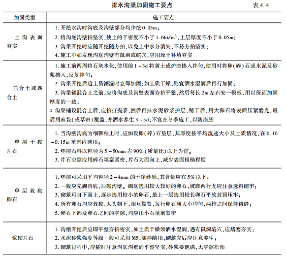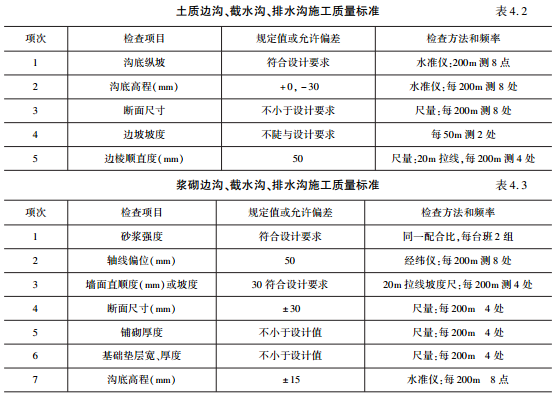 截水沟应进行防渗加固处理ꎮ 截水沟施工质量标 准见表 4. 2ꎬ浆砌截水沟施工质量标准见表 4. 3ꎮ