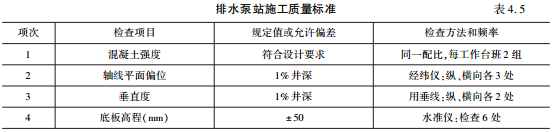 7. 排水泵站 排水泵站包括集水池和泵房ꎮ 下穿公路的路基排水应尽可能采用自流的排泄方式ꎬ在地下水位较高的平原区ꎬ自流排泄有困难时ꎬ可设置排水泵站ꎬ采用潜水泵抽升集水池中的 水ꎮ 水泵抽出的水ꎬ应排至路界之外ꎮ 集水池的容积ꎬ根据汇水量、水泵能力和水泵工作情 况等因素确定ꎮ 排水泵站的施工质量标准见表 4. 5ꎮ