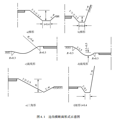 1. 边沟 边沟设置在挖方路基的路肩外侧或低路堤的坡脚外侧ꎬ多与路中线平行ꎬ用以汇集和排 除路基范围内和流向路基的少量地面水ꎮ 平坦地面填方路段的路旁取土坑ꎬ常与路基排水 设计综合考虑ꎬ使之起到边沟的排水作用ꎮ 按照岩土性质和施工方式的不同ꎬ边沟横断面可 筑成三角形、矩形、梯形和流线形等ꎬ如图 4. 1 所示ꎮ 边沟深浅和横断面大小ꎬ随地面降水量 大小而定ꎮ 梯形边沟内侧边坡一般为 1∶ 1 ~ 1∶ 1. 5ꎻ岩石边沟边坡为 1∶ 0 ~ 1∶ 0. 5ꎻ浆砌边沟 内侧边坡可直立ꎻ三角形边沟内侧边坡一般为 1∶ 2 ~ 1∶ 3ꎬ外侧坡度可参照挖方边坡ꎮ 边沟出水口的间距ꎬ一般地区不超过 500mꎬ多雨地区不超过 300mꎬ三角形和碟形边沟不超过 200mꎮ 边沟出水口的排放应就近排至路旁自然水沟或低洼地带ꎬ必要时添设涵洞ꎬ将边沟水 引至路基另一侧排出ꎮ