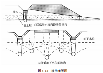 4. 渗井 渗井是一种立式的地下排水设施ꎮ 当地下存在多层含水层ꎬ其中影响路基的上部含水 层较薄ꎬ排水量不大ꎬ且平式渗沟难以布置时ꎬ采用立式(竖向)排水的渗井ꎬ向地下穿过不透 水层ꎬ将上层的含水层的水引入到下层渗水层ꎬ以降低上层的地下水位或全部予以排除ꎬ如 图 4. 16 所示ꎮ 由于渗井施工不易ꎬ单位渗水面积的造价高于渗沟ꎬ易于淤塞ꎬ选用较少ꎮ