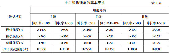 在渗沟的迎水面设置粒料反滤层时ꎬ粒料反滤层应用颗粒大小均匀的碎、砾石ꎬ分层填 筑ꎮ 土工布反滤层采用缝合法施工时ꎬ土工布的搭接宽度大于 100mmꎮ 铺设时紧贴保护层ꎬ 但不宜拉得过紧ꎮ 土工布破损后应及时修补ꎬ修补面积应大于破坏面积的 4 ~ 5 倍ꎮ 用于反 滤层的无纺土工布应符合«公路土工合成材料应用技术规范» (JTJ/ T019)的强度基本要求ꎬ 如表 4. 8 所示ꎮ 一般情况下ꎬ宜采用Ⅱ级土工织物ꎻ如铺设条件良好ꎬ可采用Ⅲ级ꎻ如所处环 境有冲刷时应采用Ⅰ级ꎮ 土工织物的单位面积质量宜选用 300 ~ 500g / m 2 ꎮ