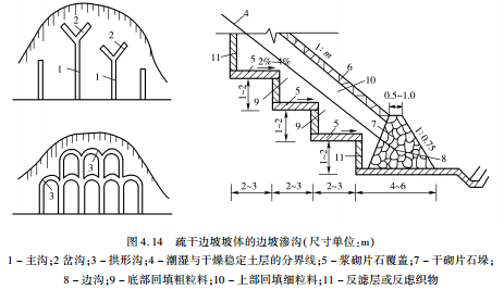 边坡渗沟主要用于疏干潮湿的土质路堑边坡坡体和引排边坡上局部出露的上层滞水或 泉水(图 4. 14)ꎬ坡面采用干砌片石覆盖ꎬ以确保边坡干燥、稳定ꎮ 边坡渗沟的基底应设置在 潮湿土层以下的干燥地层内ꎬ阶梯式泄水坡坡度宜为 2% ~ 4% ꎮ 基底应铺砌防渗层ꎬ沟壁应 设反滤层ꎬ其余部分用透水性材料填充边坡渗沟深度视边坡潮湿土层的厚度确定ꎬ原则上应 埋入潮湿带以下较稳定的土层内或地下水位线以下ꎬ最好将沟底置于坚硬不透水层内ꎬ应比 滑动面低 0. 50mꎮ
