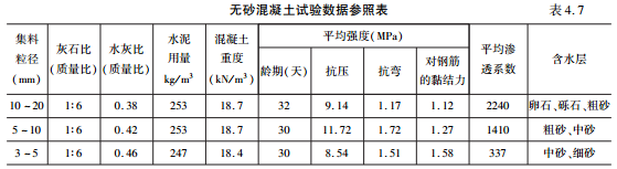 配置无砂混凝土时需进行透水能力的试验ꎮ 每次浇筑混凝土时宜用扒平后轻轻插入的 捣固方法ꎬ若过重会减弱其透水性能ꎮ 投掷高度不宜超过 1mꎬ过高投掷会造成水泥浆与石 子离析ꎮ 养生温度宜保持在 10 ~ 20℃ ꎮ 无砂混凝土的参考试验数据如表 4. 7 所示ꎮ
