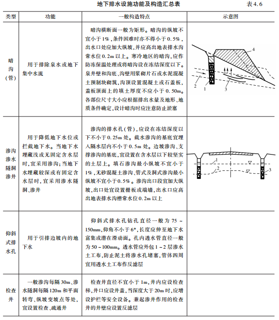 路基地下排水设施包括暗沟(管)、渗沟、渗水隧洞、渗井、仰斜式排水孔、检查疏通井等ꎮ 地下排水设施的类型、位置及尺寸应根据工程地质和水文地质条件确定ꎬ并与地表排水设施 相协调ꎮ 各地下排水构造物的构造要求如表 4. 6 所示: