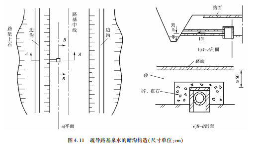 相对于地面排水的明沟而言ꎬ暗沟又称盲沟ꎬ具有隐蔽工程的含义ꎮ 暗沟(管)用于排除 泉水或地下集中水流ꎬ如图 4. 11 所示ꎮ 从盲沟的构造特点出发ꎬ由于沟内分层填以大小不 同的颗粒材料ꎬ利用渗水材料透水性将地下水汇集于沟内ꎬ并沿沟排泄至指定地点ꎬ此种构 造相对于管道流水而言ꎬ习惯上称之为盲沟ꎬ在水力特性上属于紊流ꎮ 暗沟设在路基旁侧时ꎬ宜沿路线方向布置ꎻ设在低洼地带或天然沟谷处时ꎬ宜顺山坡的沟谷走向布置ꎮ