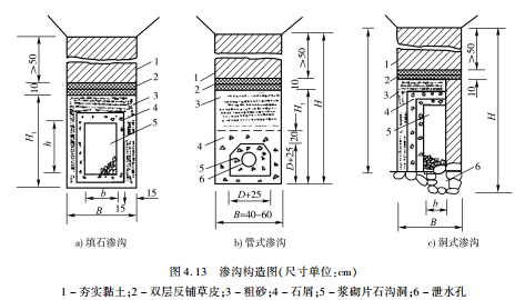 在盛产石料地区可采用洞式渗沟ꎬ在路基范围外拦截地下水ꎮ 洞式渗沟填料顶面宜高 于地下水位ꎬ顶部必须设置封闭层ꎬ厚度应大于 500mmꎮ 盖板间留有 20mm 的缝隙ꎬ在盖板 顶上铺以透水的土工织物ꎮ 渗沟的迎水面处应设置多层反滤层ꎬ每层由 150 ~ 250mm 厚的 粒料组成ꎬ其级配组成应满足反滤层要求和排水要求ꎮ 填石渗沟、管式渗沟、洞式渗沟构造 图见图 4. 13