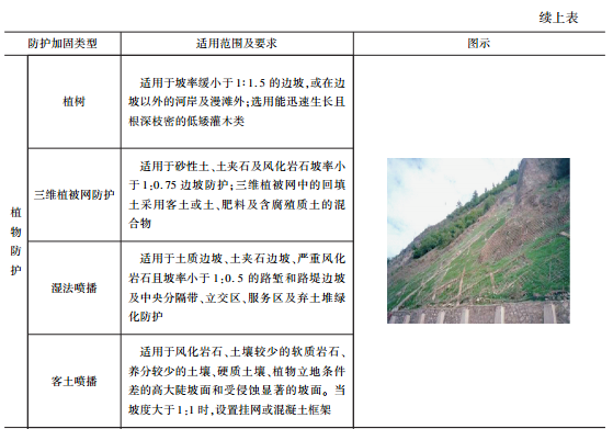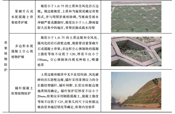 植物防护有植被防护、三维植被网防护、湿法喷播、客土喷播等类型ꎻ骨架植物防护有浆 砌片石或水泥混凝土骨架植草护坡、多边形水泥混凝土空心块植物护坡、锚杆混凝土框架植 物防护等类型ꎮ