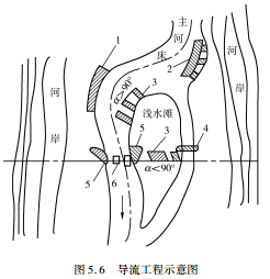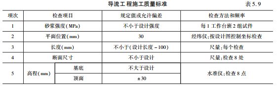 (9)顺坝防护施工ꎮ 顺坝与上下游河岸的衔接ꎬ应使水流顺畅ꎮ 起点应选择在水流匀顺 的过渡段ꎬ坝根位置宜设在主流转向点的上方ꎬ坝根嵌入稳定河岸内的距离应符合设计要 求ꎬ坝根附近河岸应防护加固至上游不受水流冲击处ꎮ 丁坝、顺坝施工质量应符合表5.9的规定ꎮ 导流工程示意图见图5.6ꎮ