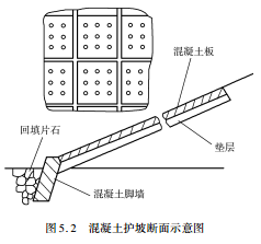 (5)水泥混凝土预制块护坡施工ꎮ 在寒冷地区ꎬ预制块混凝土强度等级不宜低于 C20ꎮ 路堤 边坡护坡宜在路堤沉降稳定后施工ꎮ 铺设混凝土预制块前将坡面平整ꎬ碎石或砂砾垫层的 厚度不宜小于 100mmꎮ 预制块应错缝砌筑ꎬ砌筑坡面应平顺ꎬ并与相邻坡面顺接ꎮ 泄水孔的 位置应符合设计要求ꎬ并保证畅通ꎮ 水泥混凝土预制块护坡示意图见图 5. 2ꎮ