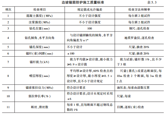 (2)锚杆挂网喷射混凝土(砂浆)防护施工ꎮ 锚杆嵌入稳固基岩内ꎬ锚固深度根据设计 要求结合岩体性质确定ꎮ 锚杆孔深应大于锚固长度 200mmꎮ 钢筋保护层厚度不宜小于 20mmꎮ 固定锚杆的砂浆应捣固密实ꎬ钢筋网与锚杆连接牢固ꎮ 铺设钢筋网前宜在岩面喷射 一层混凝土ꎬ钢筋网与岩面的间隙宜为 30mmꎬ然后再喷射混凝土至设计厚度ꎮ 喷射混凝土 的厚度要均匀ꎬ钢筋网及锚杆不得外露ꎮ 做好泄、排水孔和伸缩缝ꎮ 锚杆挂网喷射混凝土 (砂浆)防护施工质量应符合表 5. 3 的相关规定ꎮ