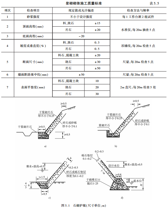 (4)浆砌片(卵)石护坡施工ꎮ 砂浆终凝前ꎬ砌体应覆盖ꎬ砂浆初凝后ꎬ立即进行养生ꎮ 路堤边坡采用浆砌片石护坡ꎬ宜在路堤沉降稳定后施工ꎮ 在冻胀变化较大的土质边坡上ꎬ护坡底面应铺设 100 ~ 150mm 厚的碎石或砂砾垫层ꎮ 每 10 ~ 15m 留一伸缩缝ꎬ缝宽 20 ~ 30mmꎮ 在基底地质有变化处ꎬ应设沉降缝ꎬ可将伸缩缝与沉降缝合并设置ꎮ 泄水孔的位置 和反滤层的设置符合设计要求ꎬ施工质量符合表 5. 5 的要求ꎮ