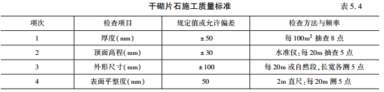 (3)干砌片石护坡施工ꎮ 边坡为粉质土、松散的砂或粉砂土等易被冲蚀的土时ꎬ碎石或 砂砾垫层厚度不宜小于 100mm ꎮ 基础选用较大石块砌筑ꎬ如基础与排水沟相连ꎬ基础则设 在沟底以下ꎬ并按设计要求砌筑浆砌片石ꎬ如图 5. 1 所示ꎮ 砌筑应彼此镶紧ꎬ接缝要错开ꎬ缝 隙间用小石块填满塞紧ꎮ 施工质量符合表 5. 4 的要求ꎮ
