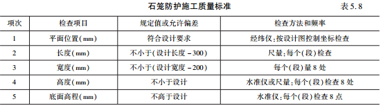 (5)石笼防护施工ꎮ 根据设计要求或不同情况和用途ꎬ合理选用石笼形状ꎬ石笼应做到 位置正确ꎬ搭叠衔接稳固、紧密ꎬ确保整体性ꎻ选用浸水不崩解、不易风化的石料ꎻ基底应大致 整平ꎬ必要时用碎石或砾石垫层找平ꎮ 石笼防护施工质量应符合表 5. 8 的规定ꎮ