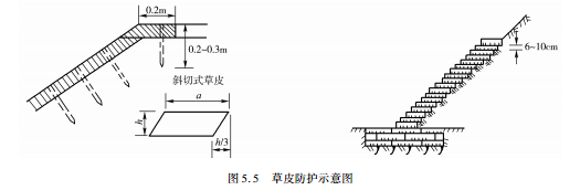 (1)植物防护施工ꎮ 沿河路堤边坡铺草皮防护ꎬ宜采用平铺、叠铺草皮的方法ꎬ如图 5. 5 所示ꎬ铺置符合设计要求ꎬ基础部分的铺置层的表面应与地面齐平ꎮ 经常浸水或长期浸水的 路堤边坡ꎬ不适合种草防护ꎮ 植树选用喜水性树种ꎬ林带由多行树木组成ꎬ乔灌木密植ꎬ植树 后ꎬ采取有效措施加以保护ꎮ 植树防护宜采用带状或条形ꎮ 防护河岸路基或防御风浪侵蚀ꎬ 宜采用横行带状ꎻ防护桥头引道路堤ꎬ宜采用纵行带状ꎮ