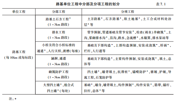 建设项目划分为单位工程、分部工程、分项工程三级ꎮ 路基单位工程中分部和分项的划 分内容见表 7. 1ꎮ