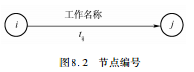 ②节点编号:为便于检查和计算ꎬ每个节点均应统一编 号ꎬ一条箭线前后两个节点的号码就是该箭线表示的工作 代号ꎮ 节点编号可以不连续ꎬ但不能重复ꎬ且箭尾节点的号 码要小于箭头节点的号码ꎮ 一项工作的表示方法如图 8. 2 所示ꎮ