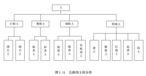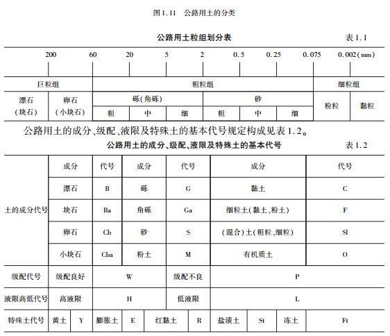 我国公路用土依据土的颗粒组成特征、土的塑性指标和土中有机质存在的情况ꎬ分为巨 粒土、粗粒土、细粒土和特殊土四类ꎬ并进一步细分为 12 种土ꎬ如图 1. 11 所示ꎮ 土的颗粒组 成特征用不同粒径粒组在土中的百分含量表示ꎮ 表 1. 1 为不同粒组的划分界限及范围ꎮ