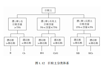 在粗(巨)粒土中巨粒土质量多于或等于粗粒土粒质量的土称巨粒土ꎬ分类体系示意图 见图 1. 12ꎮ