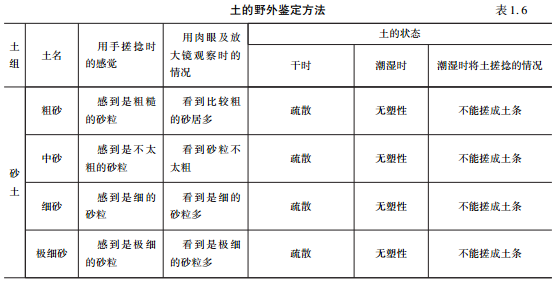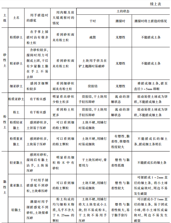 (2)根据各土组的分类标准ꎬ通过土的颗粒分析及必要时塑性指数和液限试验ꎬ即可划 分土类ꎮ 但在路基设计中通常仅需判断土组即可ꎬ并且判断方法宜简便、快速ꎮ 表 1. 6 列出 了路基用ꎮ