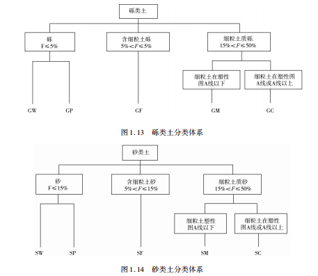 试样中巨粒组中土粒质量少于或等于 15% ꎬ且巨粒组土粒与粗粒组土粒质量之和多于 总土质量 50% 的土称粗粒土ꎮ 粗粒土中砾类组质量多于砂粒组质量的土称砾类土ꎬ砾类组 质量少于或等于砂粒组质量的土称砂类土ꎮ 砾类土和砂类土分类体系分别见图 1. 13 和图 1. 14ꎮ