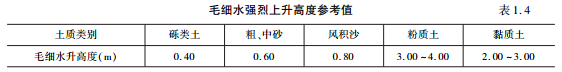 毛细水强烈上升高度与土质的颗粒粗细、矿物成分和地下水矿化度有关ꎮ 根据以往观 测资料ꎬ毛细水强烈上升高度见表 1. 4ꎬ可参考使用ꎮ
