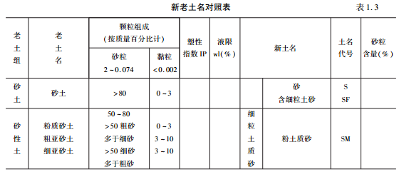 土的原有土名(93 规程)中土名是按照颗粒组 成机械地划分ꎬ不同于新的分类体系ꎬ要完全套用新土名和代号有一定的困难ꎬ与现分类土 名大致对照见表 1. 3ꎮ