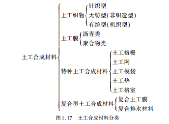 土工合成材料品种多ꎬ选用基材复杂ꎬ制造方式也千差万别ꎮ 土工合成材料可分为土工 织物、土工膜、特种土工合成材料和复合型土工合成材料等类型ꎬ见图 1. 17ꎮ