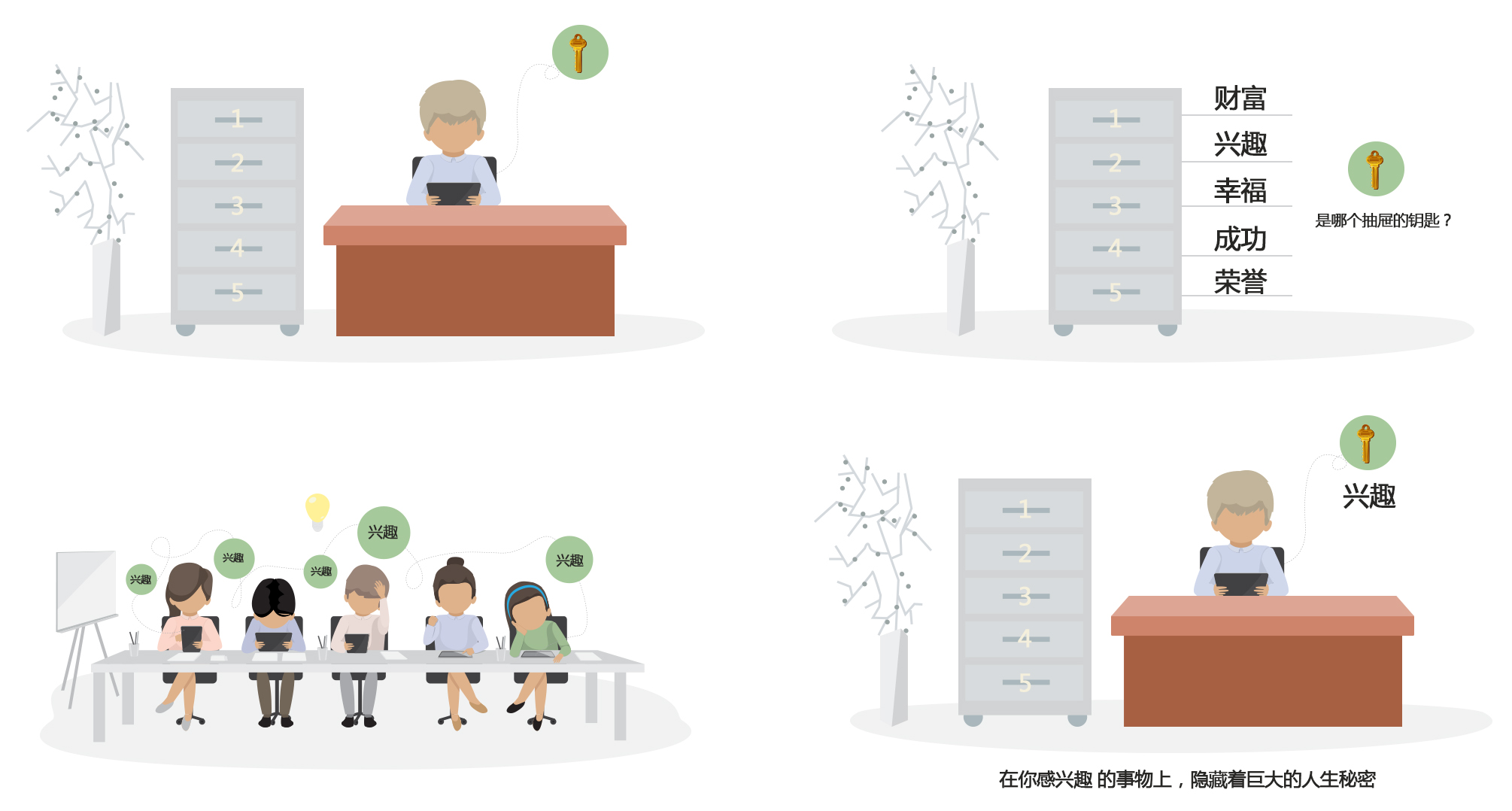 第二幅:这五个抽屉里分别装的是财富、兴趣、幸福、成功、荣誉。问:比尔·盖茨带的是哪个抽屉的钥匙?为什么?