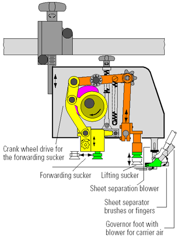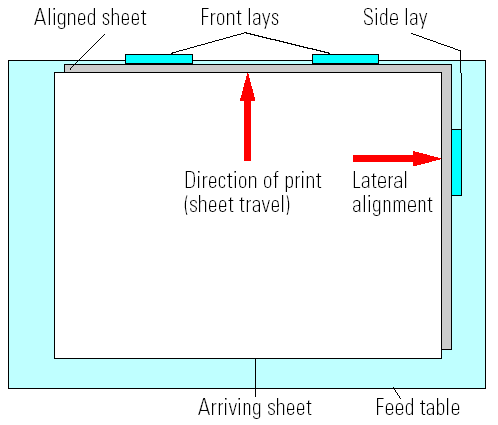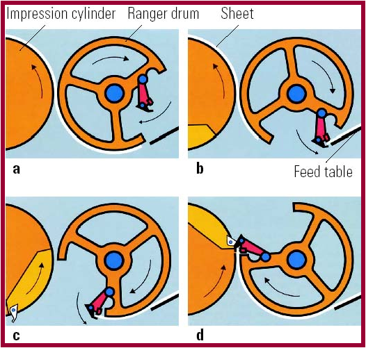 定位:保证单张纸进入印刷之前位置精确一致,将纸张一张张传递给印刷滚筒。