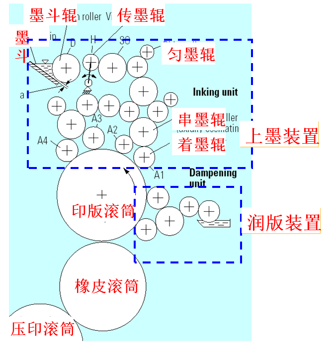 胶印机:输纸 + 输墨 + 输水 + 印刷 + 收纸装置
