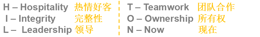 环球希尔顿酒店的价值理念可以用代表HILTON这六个首字母单词表述