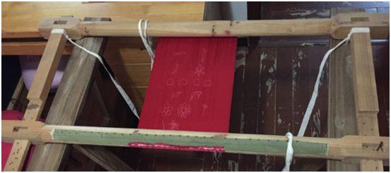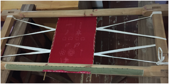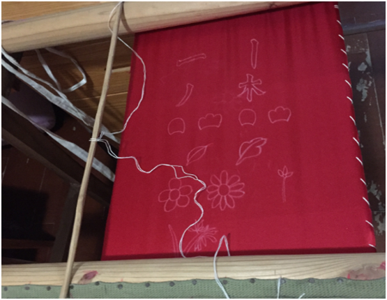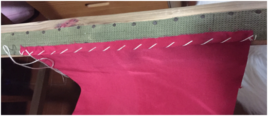 四、将绑有绷线的粗竹签缝于绣片左右两侧,线要拉紧。