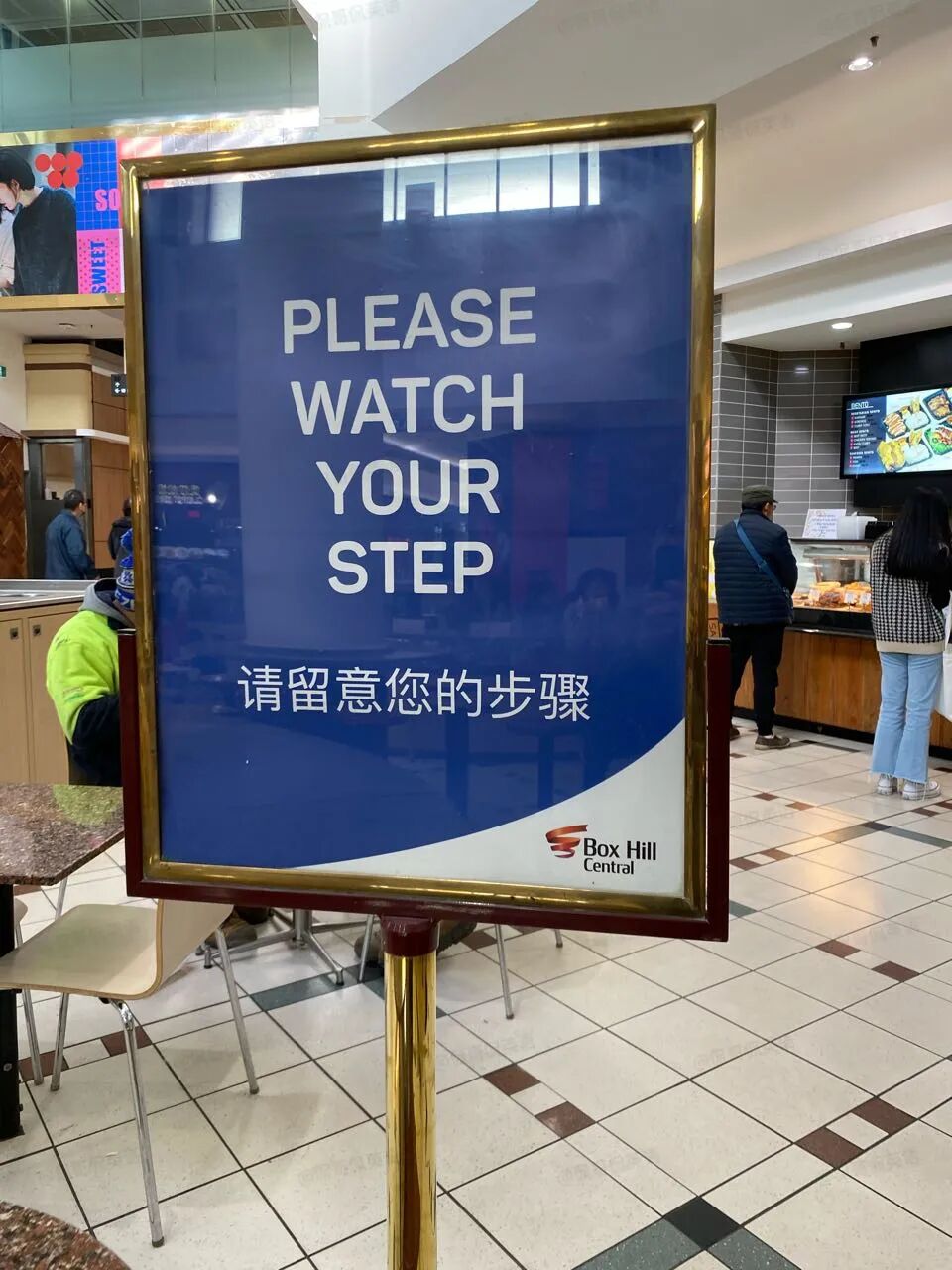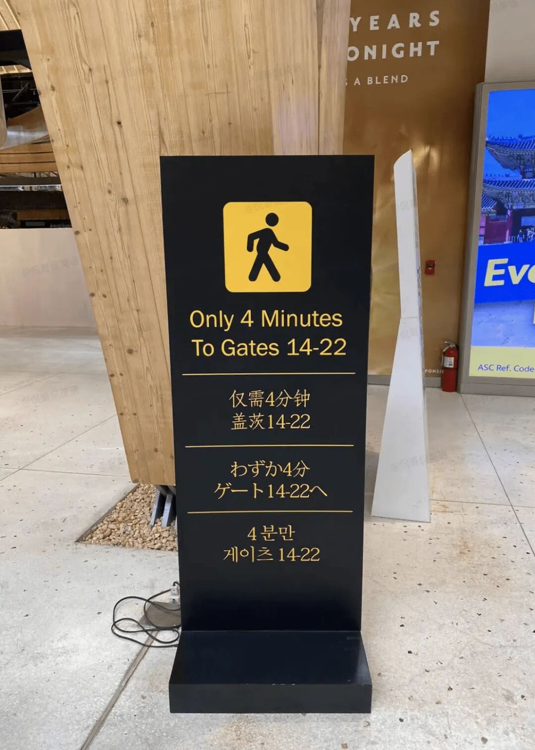 商店里这块牌子英文是 please watch your step,中文是“请留意您的步骤”,估计中国人看了一脸懵圈。Step 有两个意思,一是“脚步、步子”,比如 He walked with a quick light step.(他迈着轻快的步子走着);二是“步骤”,比如 step one, step two(第一步,第二步)。牌子上的 please watch your step,就是让你留心你的脚步,可能刚拖过地,地面比较湿滑,所以此处正确翻译是:小心地滑。这应该是泰国某个洗手间的牌子,上面还有泰文,中间是中文“请冲洗干净所有的时间”,不知道啥意思,看了英语才明白:Please flush clean all the timeall the time 是“一直、每时每刻”,就是让你用完就冲,一直要保持厕所被冲洗干净的状态。下面这句话也够离谱,“请不要离开卫生纸倒马桶”,英语是 Please do not dispose sanitary napkins and toilet paper down the toilet这里dispose 表示“丢弃”,sanitary napkin 是“卫生巾”,toilet paper是“卫生纸”,所以这句话的正确翻译是:不要把卫生巾、卫生纸丢进马桶。这应该是俄语吧?我们看到牌子中间的英文是departures business class,被翻译为“出发商务课程”。Departure 是机场常用的词,表示“出发”,顺便说一下,“到达”叫 arrival。Business class是飞机的一种舱位,叫“商务舱”。顺便说一下飞机上的三种舱位:头等舱 first class;商务舱 business class;经济舱 economy class。class 的确有“课程”的意思,但机场场景中,表示“舱位”。估计这家机场还把 economy class 翻译成了“经济课”。这应该也是机场上的指示牌,英文写着:Only 4 minutes to Gates 14-22英语基础不错的同学都知道,这表示从这里到14-22号登机口需要步行4分钟。Gates 在机场场景中表示“登机口”,但这块牌子的中文翻译是:4分钟,盖茨14-22,“比尔·盖茨”莫名其妙躺枪。