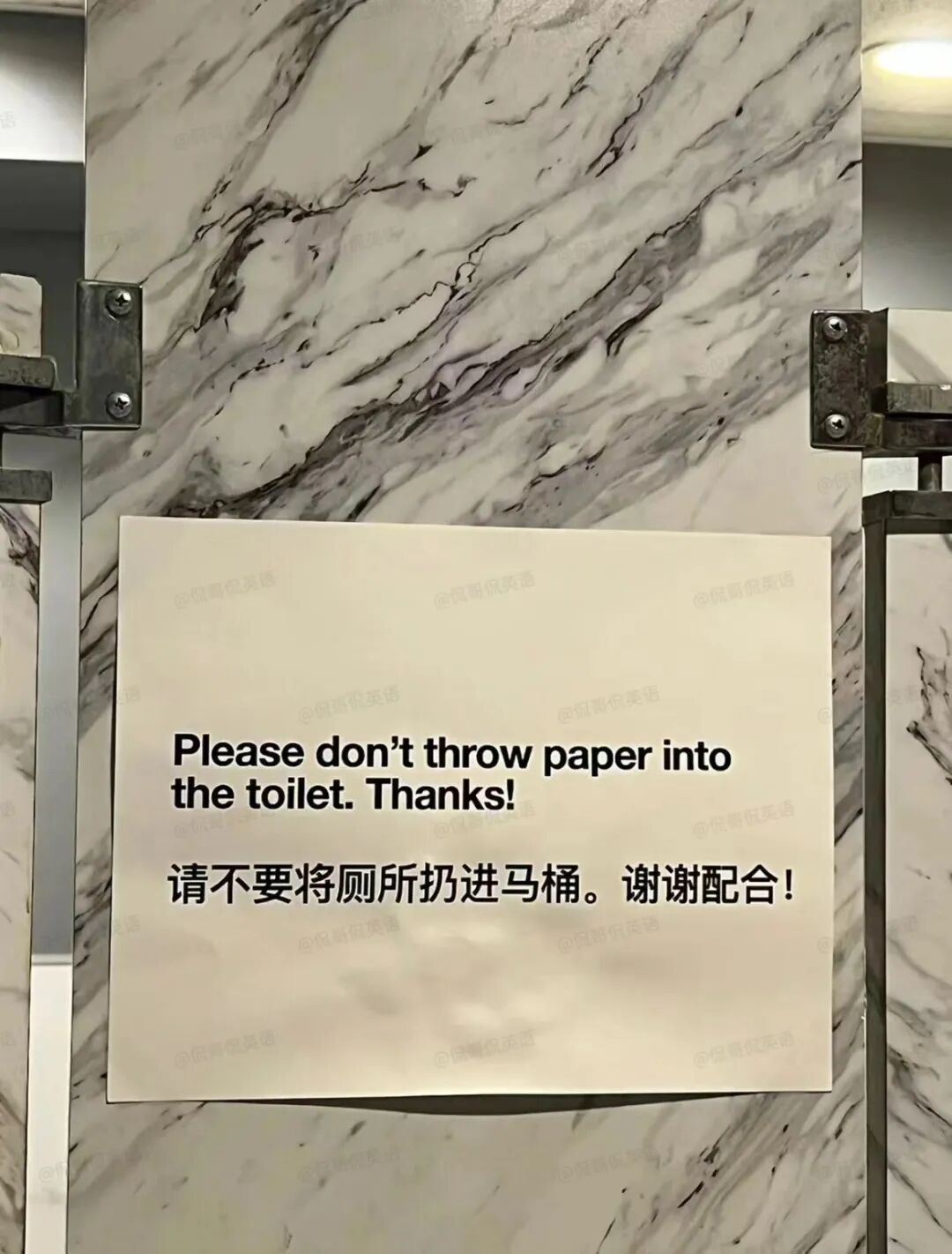 又是一个洗手间的公示语:please don’t throw paper into the toilet. Thanks.意思不难理解,“请不要把纸扔进马桶” 但下面的中文是“请不要将厕所扔进马桶”,对不起,我脑子不够用了,“把厕所扔进马桶”?这玩意高科技啊。