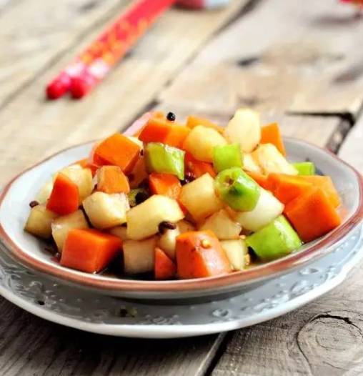 1、白萝卜、胡萝卜去皮切成指头大小丁,樱桃小萝卜切成指头大小丁。