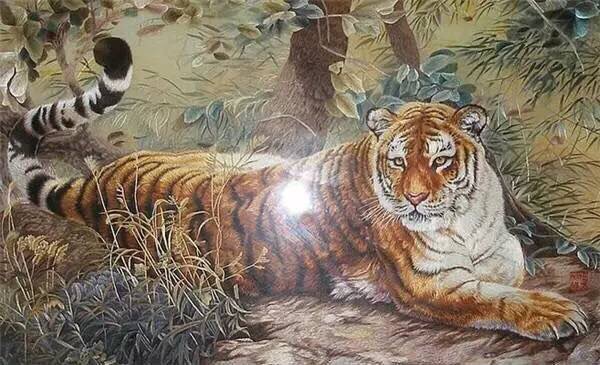 它以写实居多,色彩明快,以中国画为底,衬上相应的云雾山水、亭台楼阁、飞禽走兽,风格豪放,尤其是绣虎、狮等,以独特的针法绣出的动物毛丝根根有力。