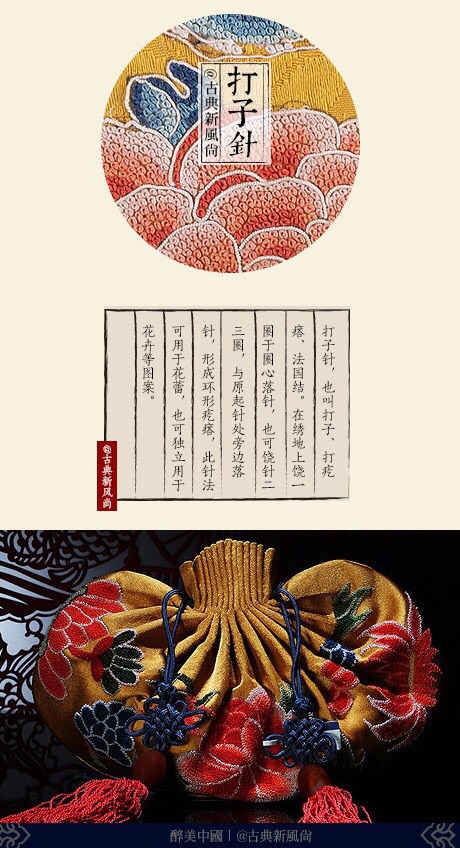 打字针打子针,也叫打子、打疙瘩、法国结。在绣地上饶一圈于圈心落针,也可饶针二三圈,与原起针处旁边落针,形成环形疙瘩,此针法可用于花蕾,也可独立用于花卉等图案。