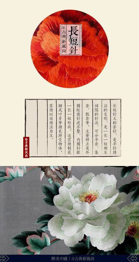 长短针长短针又称套针,是平针绣法的变形,是一长一短相互间隔的针法,可分平套、集套、散套等。主要特点是外圈轮廓针迹齐整,内圈针距一长一短形状。适宜绣制花瓣或叶片等颜色渐变物体。苏绣以该绣法为主。