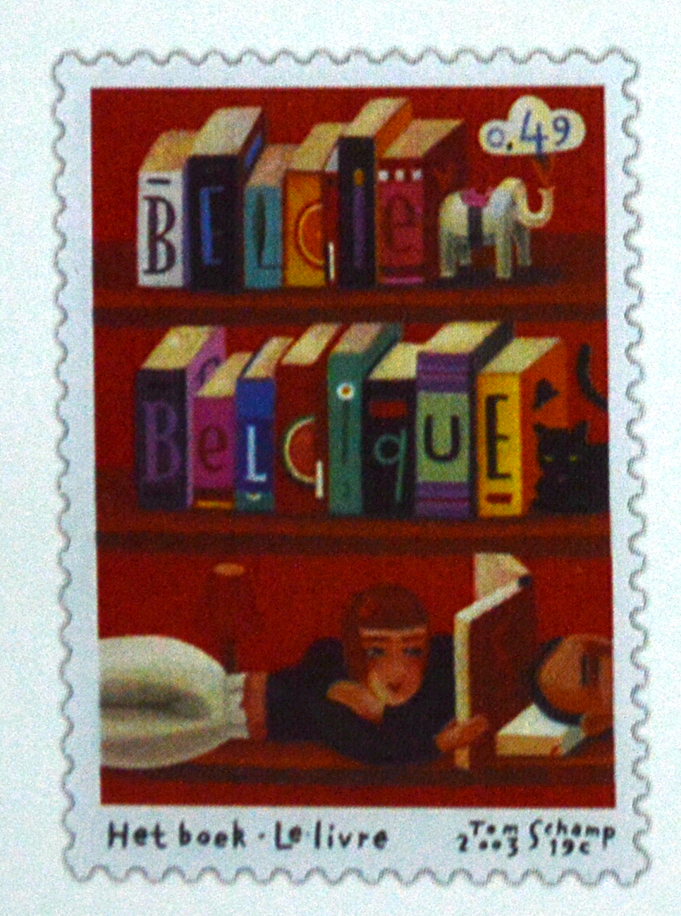 如若要给此枚珍邮命名,我会冠以“阅读的乐趣”。书架上,作为书立的呆萌小象和傲娇小黑猫,在五颜六色、高矮不齐的两排书籍中,显得毫无违和感,反而平添了书架的灵动和趣味。再看看那两位躺在底层书架上的阅读者,女士侧身斜卧,一手托着头,另一只手扶着一本直立的精装书,俨然一副乐在其中的姿态。精装书的另一侧,只露出半个头的男士,则以书当枕,或许早已酣然入梦,或正以另一种姿态沉浸在阅读中。
