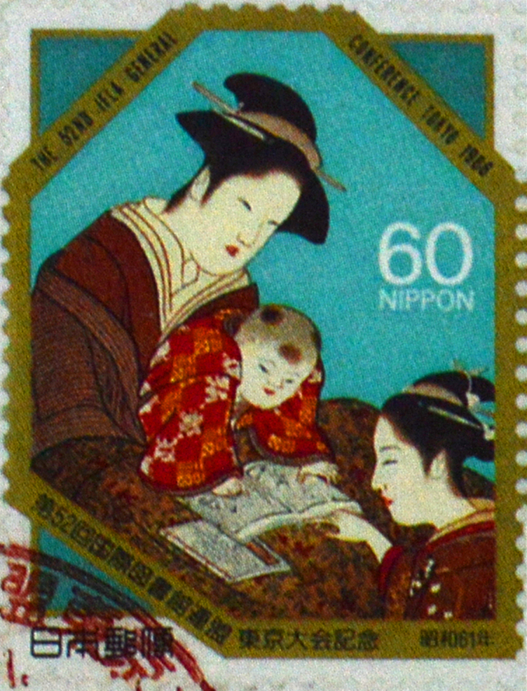 此枚珍邮源自日本,为纪念1986年在东京举办的第52届国际图联大会而发行。邮票图案出自日本胜川派始祖胜川春章所绘的《妇女风俗十二月图》。原图中,两位少女在窗前观看户外的雪景,屋内母亲抱着幼子,和女儿围坐一起观书,邮票所取的正是原画中母子三人共享阅读的场景。