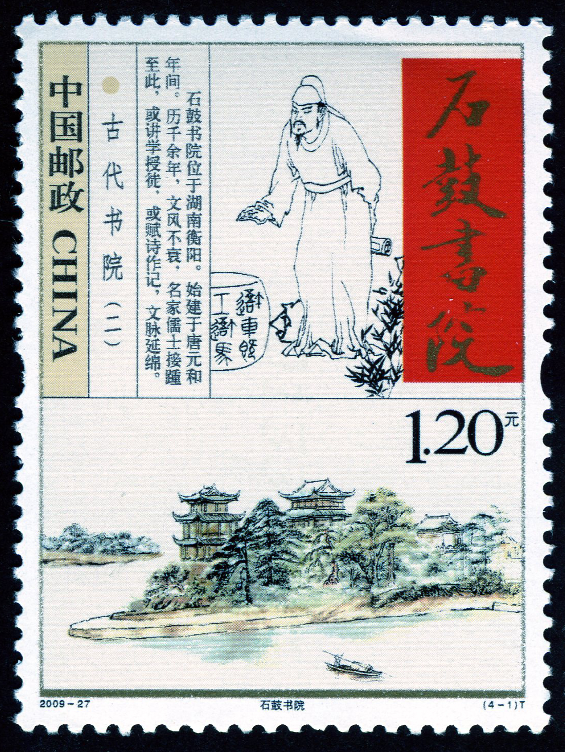 石鼓书院,位于湖南衡阳,始建于唐元和年间,是中国创建最早并具有确切史志记载的书院。经唐、宋、元、明、清各朝,书院屡经扩建修葺,韩愈、周敦颐、朱熹、文天祥、徐霞客、王夫之等接踵至此,或讲学授徒,或赋诗作记,文脉延绵。邮票上刻画了石鼓书院三面环水、绿树成荫的秀丽风光。