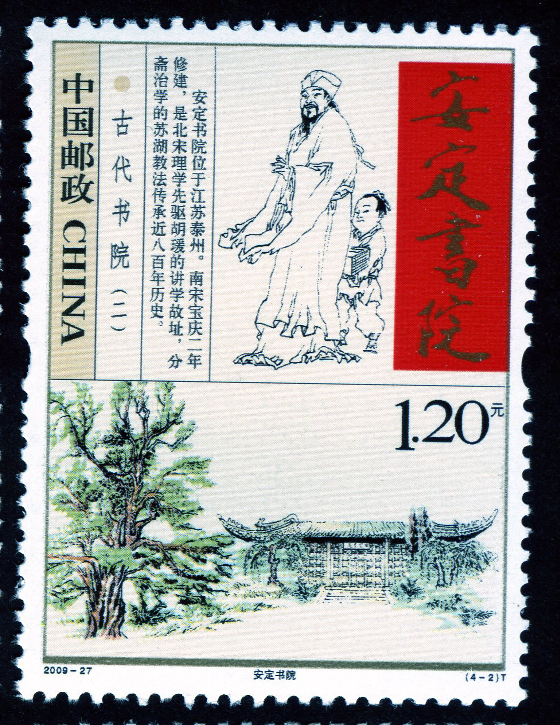 安定书院,位于江苏泰州,南宋宝庆二年(1226年)修建,是北宋理学先驱胡瑗(993-1059年)的讲学故址。分斋治学的苏湖教法传承近八百年历史。邮票上半部分展现了小小书童伴学的情景,下半部分刻画的则是书院西侧的一株千年古银杏,据说为胡瑗手植。古银杏掩映下的安定书院,静谧安详。