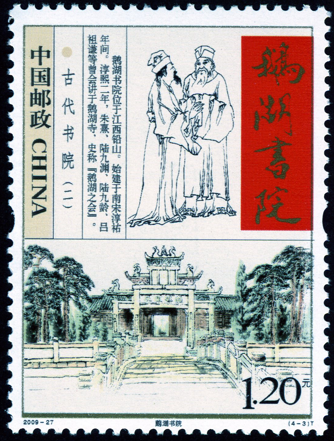 鹅湖书院位于江西铅山,始建于南宋淳祐年间。淳祐二年,朱熹、陆九渊、陆九龄、吕祖谦等曾会讲于鹅湖寺,史称“鹅湖之会”。邮票上半部分表现的正是朱熹等人“鹅湖之会”的景象,下半部分是书院始建于明正德六年(1511)的石牌坊,正面额匾:“斯文宗主”,背额匾:“继往开来”。