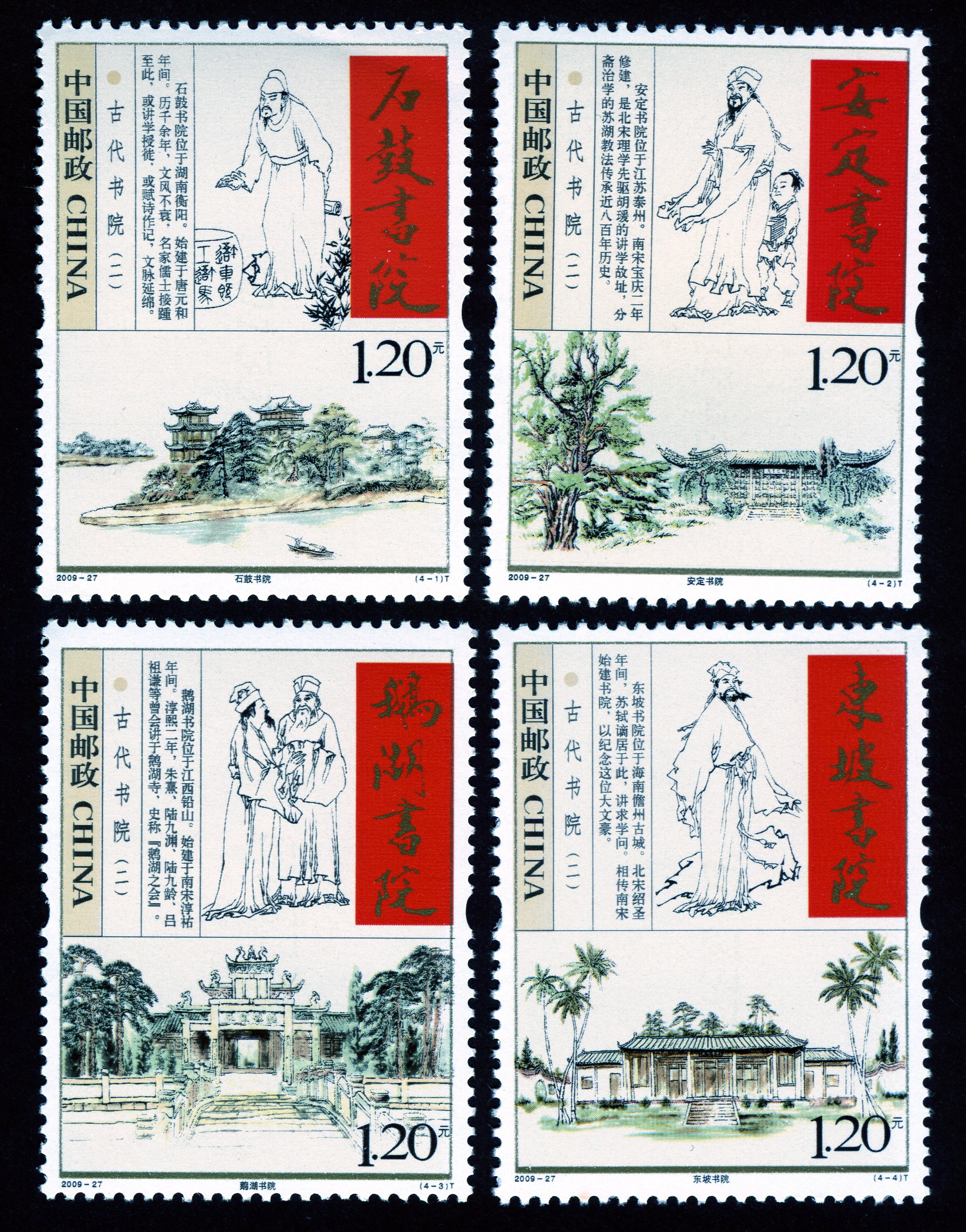 继1998年,国家邮政发行应天书院、嵩阳书院、岳麓书院、白鹿书院等一套四枚古代书院的邮票之后,于2009年11月15日又发行了《古代书院(二)》特种邮票1套4枚,选题分别为:江苏泰州的“安定书院”、湖南衡阳的“石鼓书院”、江西铅山的“鹅湖书院”和海南儋州的“东坡书院”,由著名书画家、南开大学教授范曾和著名画家邹玉利共同设计。在设计上,用白描手法表现了文人学士们在书院或讲学,或赋诗,或读书的神态,与四大书院的古朴建筑相得益彰。