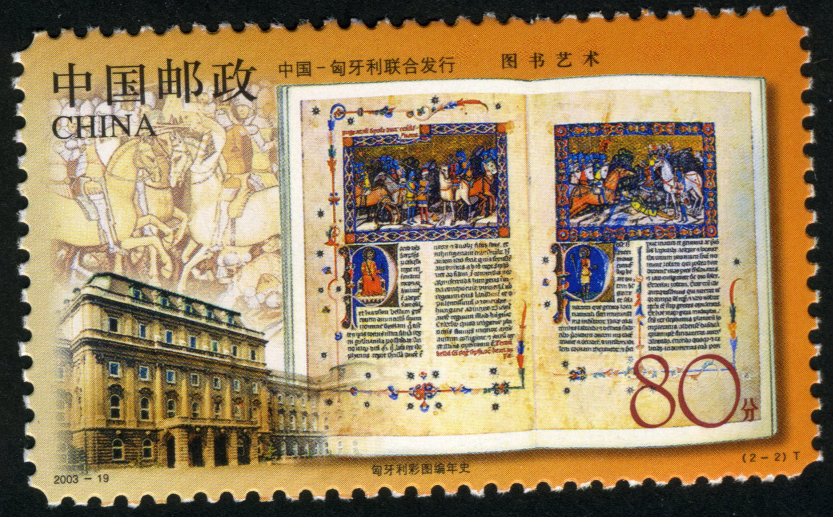 匈方邮票画面主图为打开的《匈牙利彩图编年史》,背景为匈牙利国立图书馆和《匈牙利彩图编年史》插图局部。《匈牙利彩图编年史》印制出版于1473年,是描述匈牙利安茹时代宫廷和制度的最重要的历史著作,记录了从潘诺尼匈奴的出现到1333年瓦拉几亚运动期间匈牙利人的历史。书中包括39张图片、4幅风景装饰图案、98个人物和风景彩图及5个彩色字母。这些图案从不同角度表现了匈牙利人的历史,其中包括不同的事件,阿德派和安茹家族的历史、家谱及王族的情况。文中的彩图参考了以前的编年史和宗教绘画中的图案,微缩画采用了中欧皇宫彩图的风格。该书现藏匈牙利塞切尼国家图书馆。