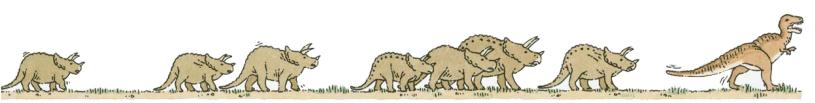 三角龙个头很大,足足有七八米长,但是它并不笨拙,因为三角龙长有短而宽的脚,非常适合行走。它的前脚有5个脚趾,后脚有4个脚趾,趾上有蹄一样的构造。通过对三角龙的研究,科学家们认为,大型的三角龙奔跑起来就像现代的犀牛一样,非常具有冲击力,时速可达50千米。三角龙的生活习性也很像今天的犀牛。犀牛是食草动物,但是连最凶猛的狮子见了也得让它三分。三角龙则表现得更为凶猛。它把剑和盾的功能全部集中在自己的头部——长而锐利的角,是向前冲刺的利剑;厚重的颈盾,不仅可以保护身体,而且可以增加冲刺时的力量。即使霸王龙想吃掉一只三角龙,也不是一件容易的事情,弄不好,反而丢了自己的性命。